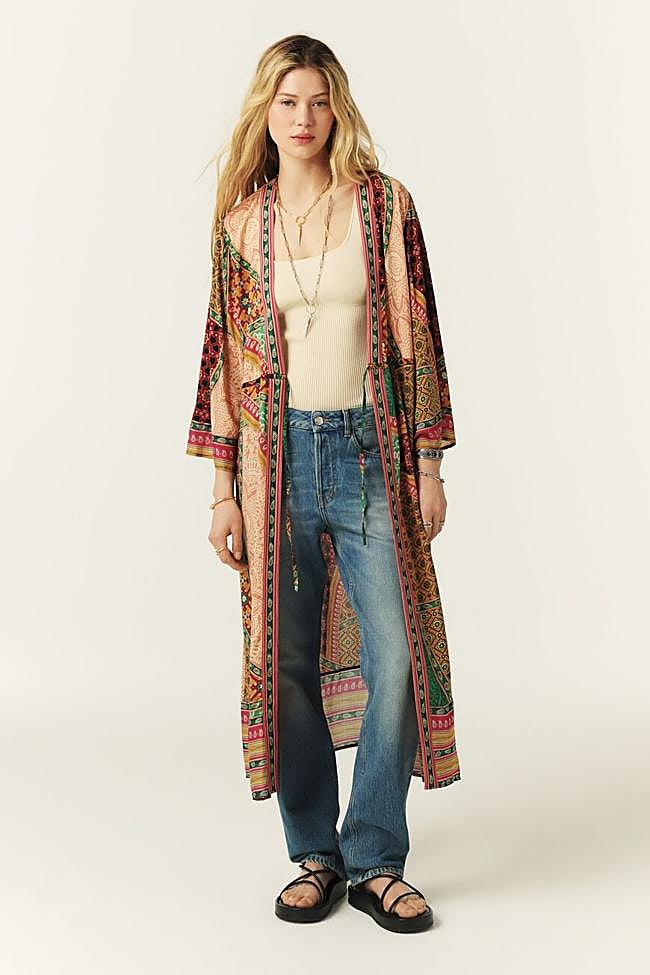 Añade un toque boho a tus looks de verano con este kimono estampado muy colorido y de tejido fluido de Ba&sh. Es largo y tiene media manga. Precio: 195 euros.