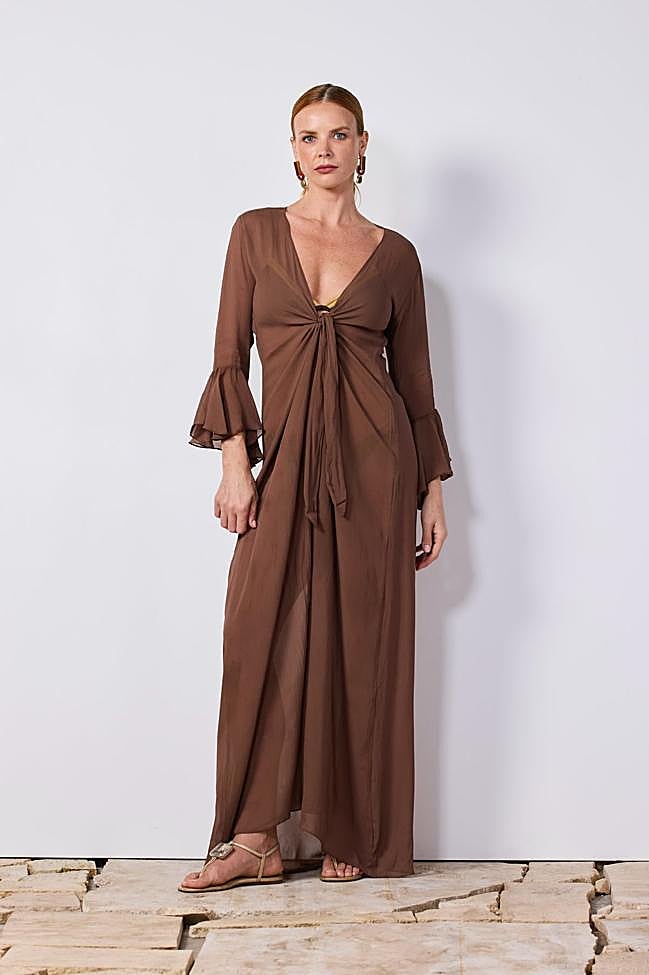 Vestido largo de playa en viscosa fluida de caída ligera de Soller en tono marrón inspirado en las capas terrosas de la piedra Ojo de Tigre. Diseñado con mangas de longitud media, volantes y frente abierto con cierre de lazo. Precio: 98 euros.