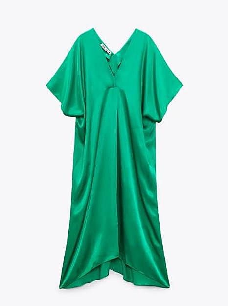 Paula Argüelles fue una de las invitadas a la boda de Lucía Bárcena y para la preboda escogió este bonito vestido satinado de Zara. Un diseño fluido y amplio de largo midi y con un diseño tipo túnica que cuesta tan solo 29,95 euros. Añadió unas sandalias doradas de Mas34.