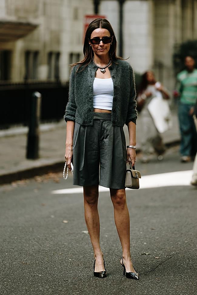 Las bermudas de traje son las favoritas de las chicas clásicas y elegantes. Y como demuestra este look, solo necesitan una camiseta básica -ya sea de tirantes o de manga corta- para conseguir un buen resultado. Unos salones kitten heel destalonados y lista.