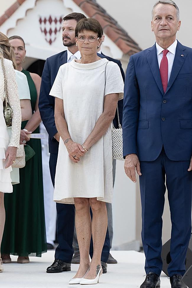 La hermana de Carolina de Mónaco apostó por el minimalismo con un vestido en color crudo de manga corta. Era un modelo de fit recto y cuello barco que acompañó de unos salones destalonados de color blanco y un bolso con detalles de brillos.