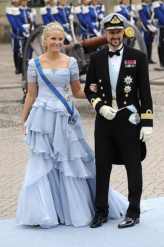 La princesa Noruega llevó un favorecedor vestido de seda en color azul celeste que le favorecía muchísimo. Tenía una silueta con corte a la cintura y falda de volantes y lo combinó con un bolso de mano y una tiara sencilla.