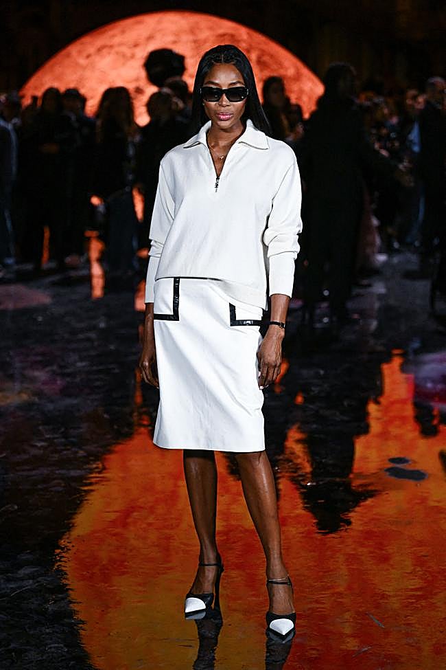 La modelo presumió de elegancia y estilo con este estilismo bicolor que, sin duda, fue de los mejores de la noche. Con falda midi y un jersey tipo polo de punto, Naomi confirmó el poder que tiene el binomio del blanco y el negro.