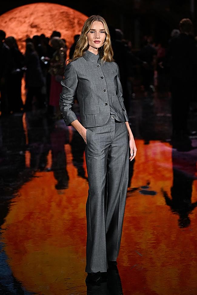Entre las opciones más clásicas estaba la elegida por la modelo y actriz británica. Escogió un conjunto en color gris marengo, una versión más sofisticada del traje de chaqueta y pantalón que ha gustado muchísimo.