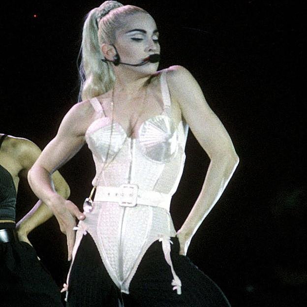 Si esto era ya suficiente muestra de provocación, después el máximo escándalo vino... (¡Pongámonos todos en pie!) El corsé cónico. Aplausos, por favor, Aplausos. Madonna lo llevó por primera vez en los American Music Awards de 1985 y sería el comienzo de una colaboración con el modisto Jean Paul Gaultier, que duraría hasta día de hoy. Para cerrar la década de los 80, la cantante recuperó el bustier puntiagudo en una nueva versión rosa satinada (subastado en Christies por 48.000 libras). Gracias a ella, ahora podemos vestir ropa lencera para salir a la calle.