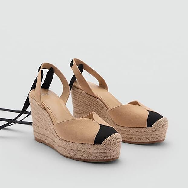 Mango. Modelo de cuña con punta redonda y tejido combinado en beige y negro (49,99 euros).