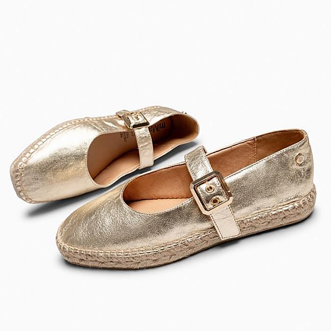 Este zapato plano de esparto de miMaO cuenta con una suela de 2.5 cm de altura y está elaborado en piel de napa de color dorado, perfecto para aquellas que no quieren pasar desapercibidas. Incluye una tira en el empeine para ofrecer un ajuste más cómodo y evitar que chancletee al caminar.