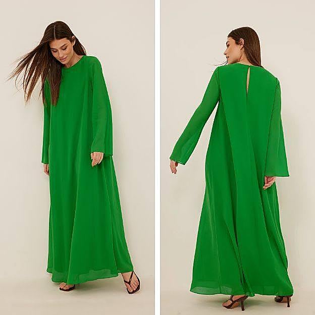 Por otro lado, en la web online de la marca NA-KD damos con un vestido de estética retro, muy sencillo, pero que hará que te sientas como una glamurosa diva de Hollywood. Se trata de un maxi vestido vaporoso de chifón, con cuello redondo, mangas largas ligeramente acampanadas, corte holgado y cierre en la espalda con una pequeña abertura, en un tono verde brillante que tiene efecto rejuvenecedor. Con un coste de 72,95 euros, sus tallas van desde la 32 a la 46.