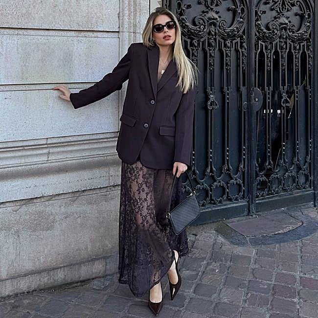 Falda de encaje y blazer. Si es del mismo color, mejor. Esta idea es perfecta para eventos o salidas algo más especiales. Puedes llevarlos con salones acabados en punta, o con bailarinas joya si quieres huir de los tacones.
