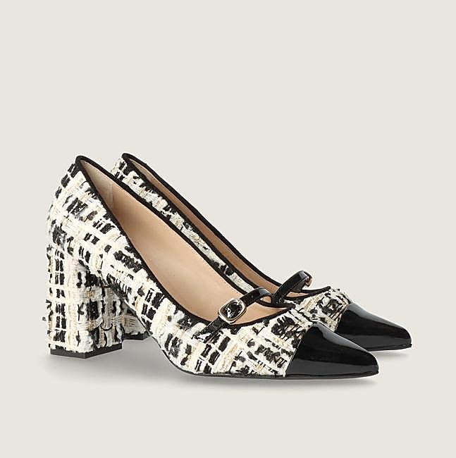 en esta firma española de calzado hemos encontrado este salón de punta fina y tacón grueso. Es el modelo Renata confeccionado en tweed blanco, negro y dorado que tiene además el diseño estilo mercedita con la puntera y la pulsera de charol negro. Precio: rebajados a 174,30 euros.