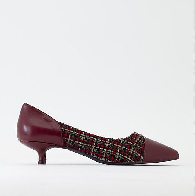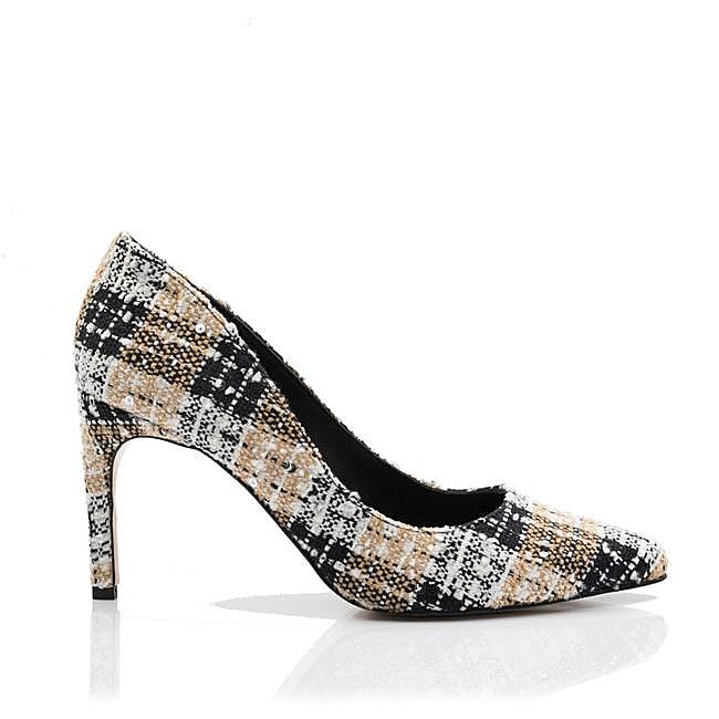 Este es un zapato de salón elegante, sofisticado y atemporal fabricado en tejido de cuadros en España. Su combinación de colores en beige, negro y blanco hacen que sea una propuesta súper ponible. Está forrado en piel de cabra lisa y acolchada y tiene la suela de cuero natural. Precio: rebajado a 149 euros.