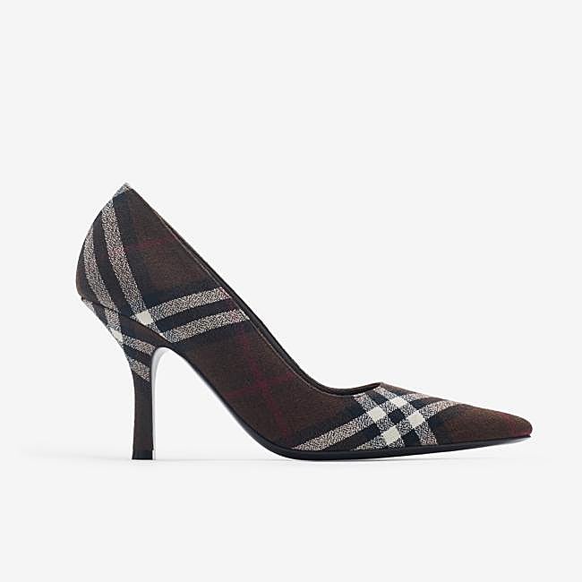 Estos zapatos de Burberry se elaboran en Italia en lana. Es un modelo de tacón de aguja que luce una puntera en forma de pico y está protagonizado por el icónico estampado a cuadros de Burberry Check. Presentan una cómoda plantilla en piel acolchada y suela con el emblema Equestrian Knight Design grabado en el característico tono Knight Blue de la marca. Precio: 655 euros.