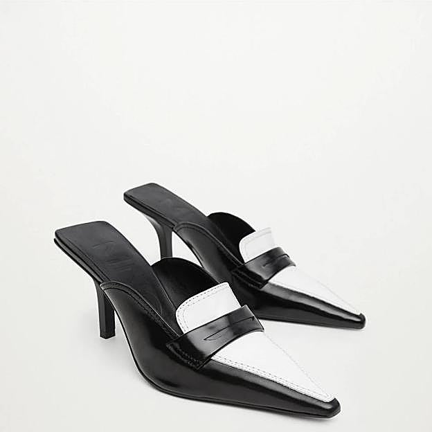 La propuesta de Mango se trata de un mocasín de tacón destalonado, confeccionado en piel y en un diseño bicolor con cuerpo negro y antifaz blanco, disponible por 69,99 euros. Super elegantes.