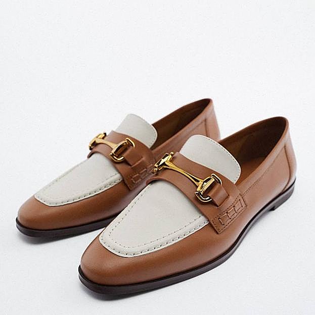 Mientras que la copia de Zara es ideal para ir sofisticada y cómoda a diario. Unos mocasines planos de piel con contraste de color en marrón y blanco, que se adornan con detalle de hebilla dorada en la parte delantera. Su precio es de 49,95 euros.
