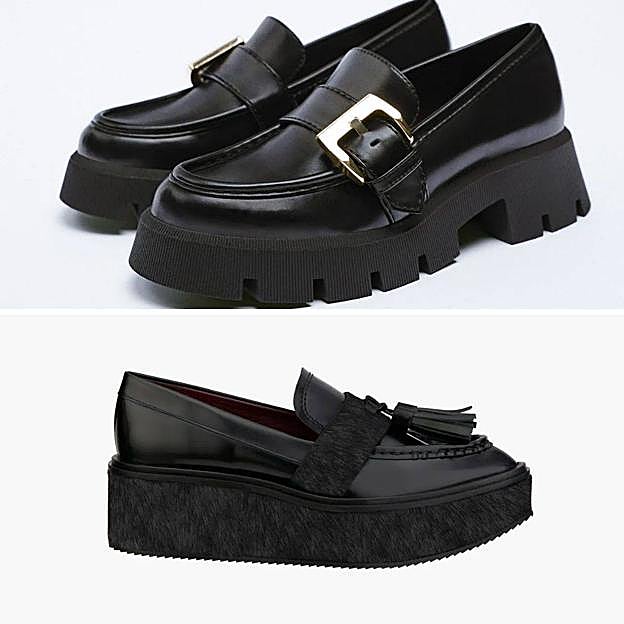Zara, nuestra tienda de cabecera con las últimas tendencias, se centra en diseños de estilo 'preppy' años 90, con suela track o plataforma, ideales para estilizar la figura y alargar las piernas, sin sacrificar la elegancia ni el confort. Uno, con suela gruesa dentada, detalle de hebilla dorada y plantilla airfit diseñada para la mayor comodidad, en negro, a lo estética 'college girl', por 39,95 euros. El otro es un mocasín Limited Edition, con suela de plataforma forrada de pelo y un antifaz en el mismo tejido, así como detalles de borlas en la parte delantera, también en negro, y que cuesta 149 euros (aunque se está agotando por minutos).