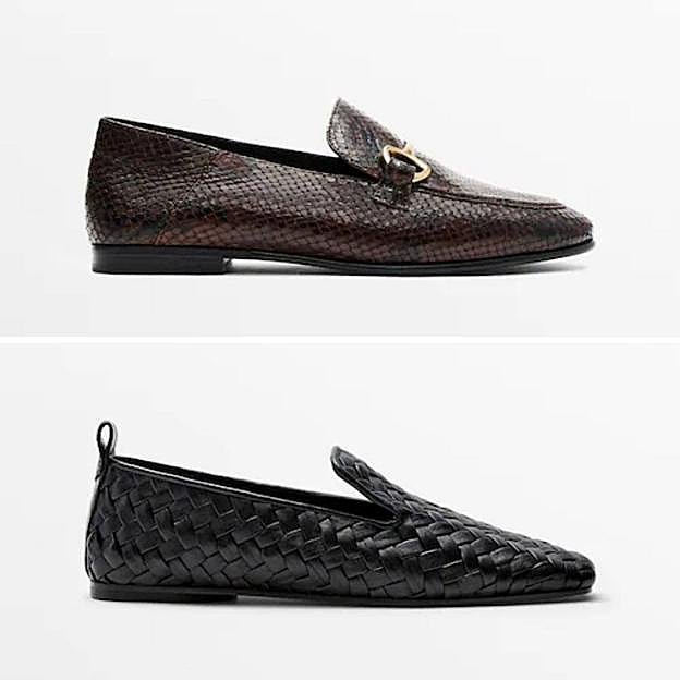 Las creaciones de Massimo Dutti siempre son las más sofisticadas. Es el caso de unos finísimos mocasines de piel grabada efecto animal print, que imita a la serpiente, en tono marrón y negro, adornados por una hebilla metálicas dorada, que puedes conseguir por 79,95 euros. El otro modelo que proponemos es más un diseño tipo slipper, de piel con la técnica del trenzado, en negro y por el mismo precio que los anteriores, 79,95 euros. Ambos perfectos para conjuntar con una clásica gabardina y derrochar aires parisinos este otoño.