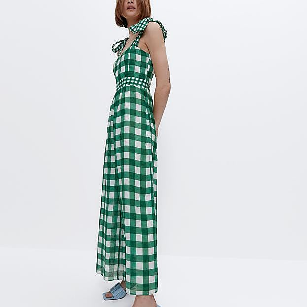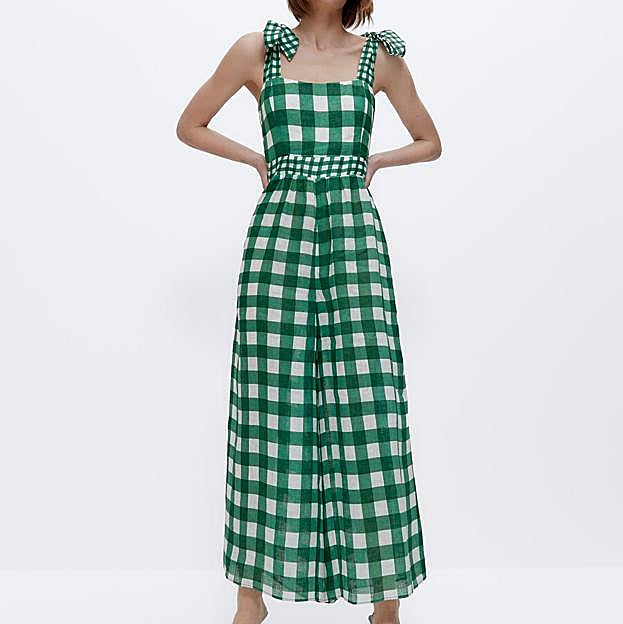 Otra propuesta perfecta para los looks diurnos de invitada o para cualquier ocasión especial es este mono de lino con estampado de cuadro vichy en blanco y verde.