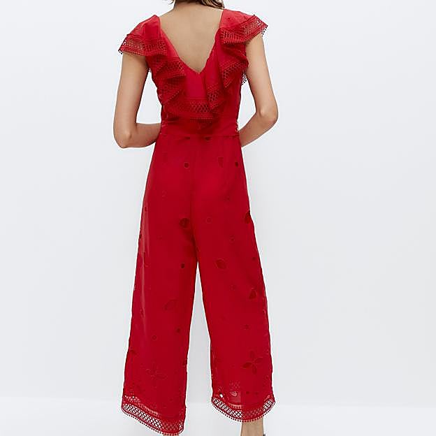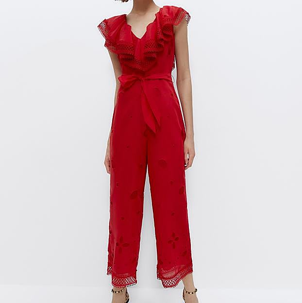 Uno de los más vistosos es este bonito mono rojo con escote de pico y mangas cortas con cinturón a tono en lazada.