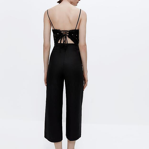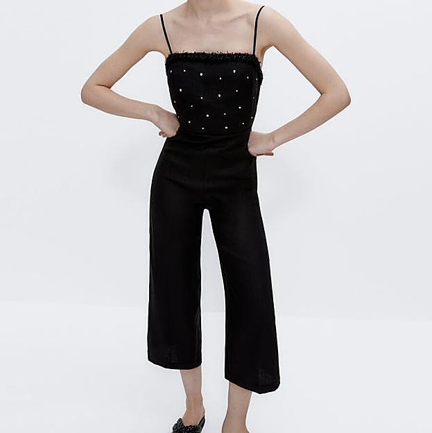 Y para los looks nocturnos Uterqüe ha lanzado este mono negro de lino con detalle de strass y triming en el cuerpo, que tiene tirantes finos y cierre de lazada en la espalda.