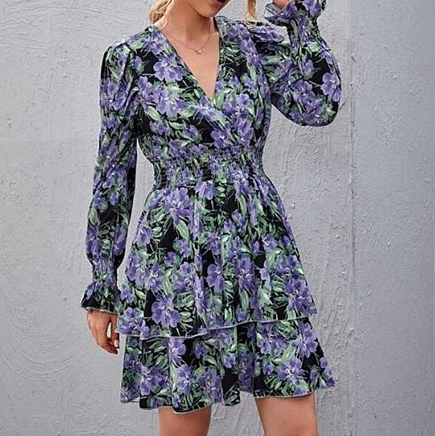 Nagore lleva un vestido de estampado floral en color lila sobre un fondo negro de Shein que cuesta tan solo... ¡8 euros! Un diseño mini, de manga larga y escote en forma de pico que lleva volantes en la falda y que queda de maravilla porque se adapta a la cintura definiendo la silueta. Y por si no quedara suficientemente bien, Nagore marcó la silueta añadiendo un cinturón ancho con hebilla de Zara. ¡Ideal!