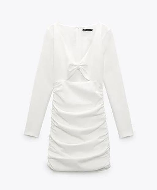 Se trata de un vestido blanco mini y de corte ajustado que tiene un diseño muy especial. La falda es drapeada con un fruncido en el lateral, tiene la manga larga yb un bonito escote cut-out con nudo en el pecho. Ideal, verdad? Cuesta 29,95 euros y está disponible desde la talla XS a la XXL.