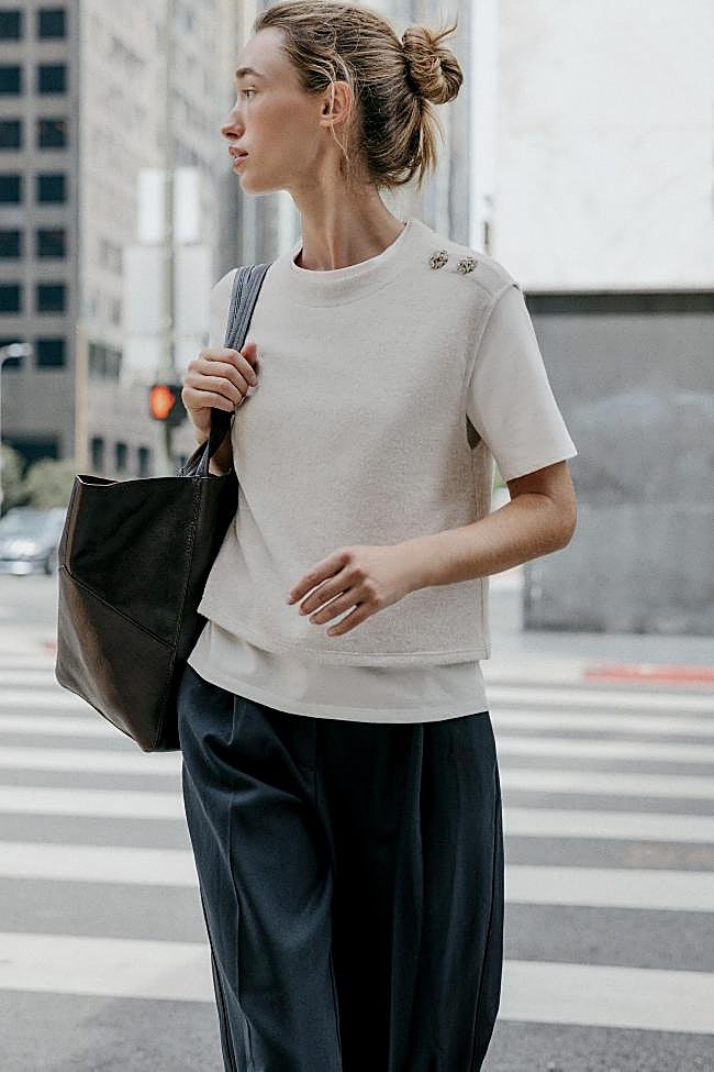 No es necesario recurrir a las lentejuelas o los brillos exagerados para conseguir un look de fiesta elegante. Un sencillo top de punto si mangas de color gris es más que suficiente para crear un look navideño de lo más efectivo.