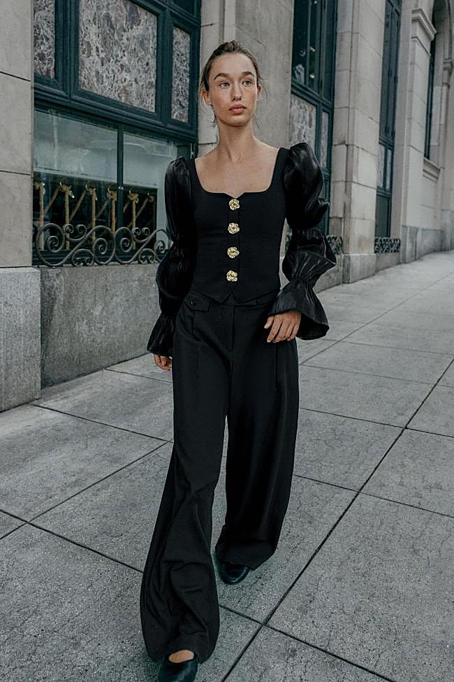 El diseño más versátil es sin duda el que llega apostando por un top con cuello polo y detalles de brillo. Llévalo con un par de vaqueros rectos para conseguir un look de fiesta favorecedor y muy relajado.