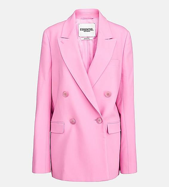 Nuria escogió para esta ocasión una blazer larga en color rosa. Un modelo cruzado, de manga larga y con cuello de solapa en un rosa claro de Essentiel Antwerp que puedes comparar ahora rebajada a 219 euros. Y la combinó con unos pantalones negros de pinzas y pernera ancha de Amateur y un top verde de Zara.