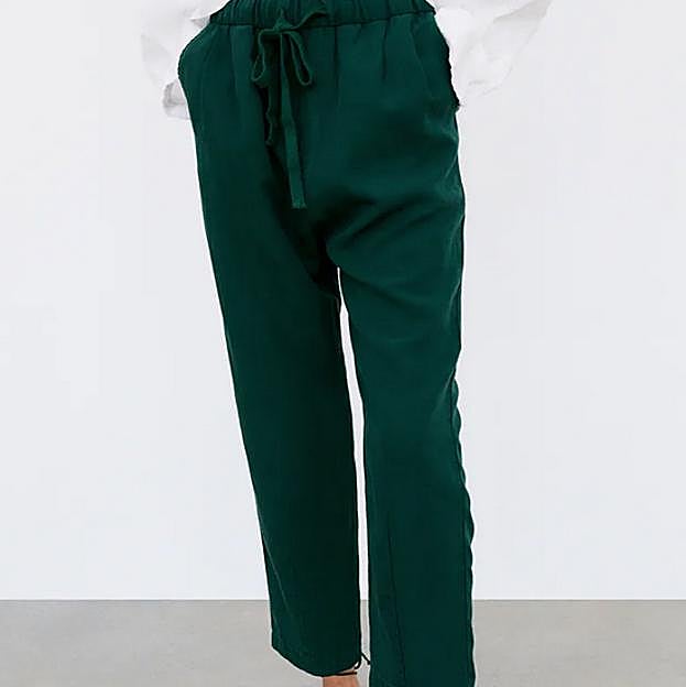 Otro diseño perfecto para combinarlo con nuestras camisas o tops blancos favoritos es este pantalón de tiro medio y cintura ajustable con cordones a tono. Tiene los bolsillos laterales ocultos y de plastrón en la espalda y detalle de pliegues en delantero. Podemos encontrarlo en verde bosque o color caqui por 29,95 euros entre las tallas XS y XXL.