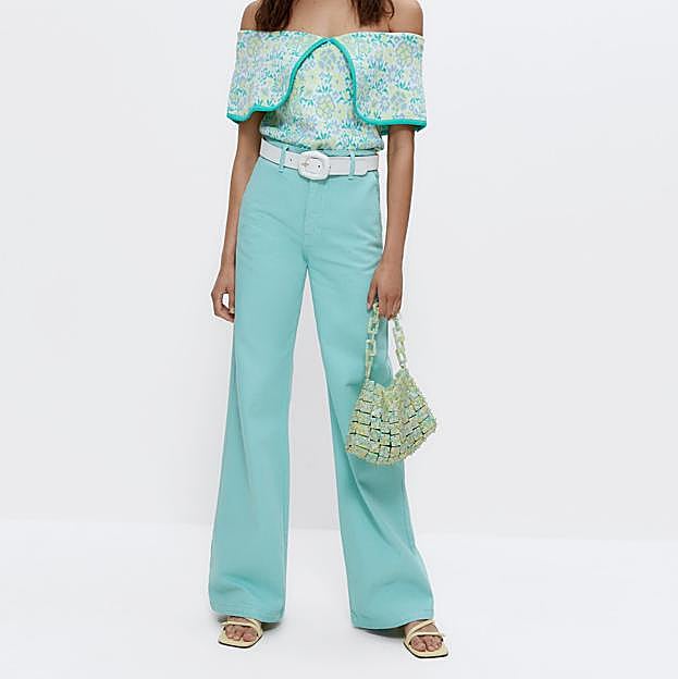 Otro de nuestros flechazos instantáneos han sido estos pantalones en aguamarina confeccionados en denim y que vienen con cinturón a tono con hebilla forrada (no el de la foto) y perneras amplias. Y no hemos sido las únicas, porque solo quedan en la talla 42, con un precio de 59 euros.