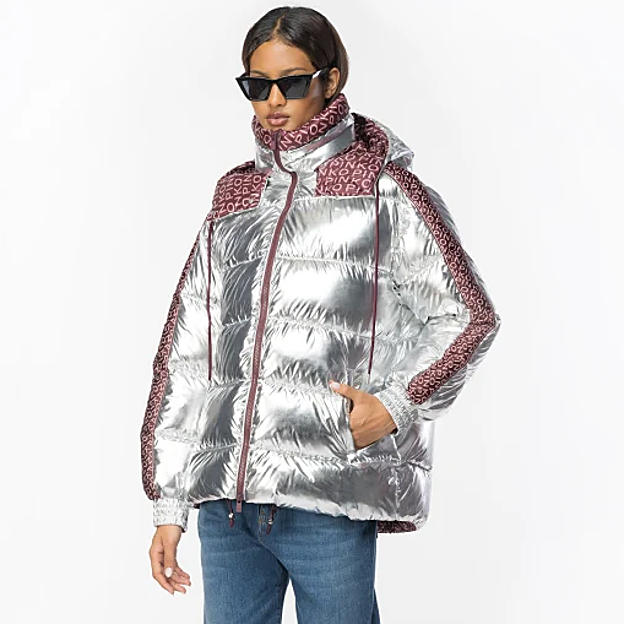 Plumífero acolchado modelo gabán de tela técnica laminada con un particular efecto espejo de Pinko (515 euros).