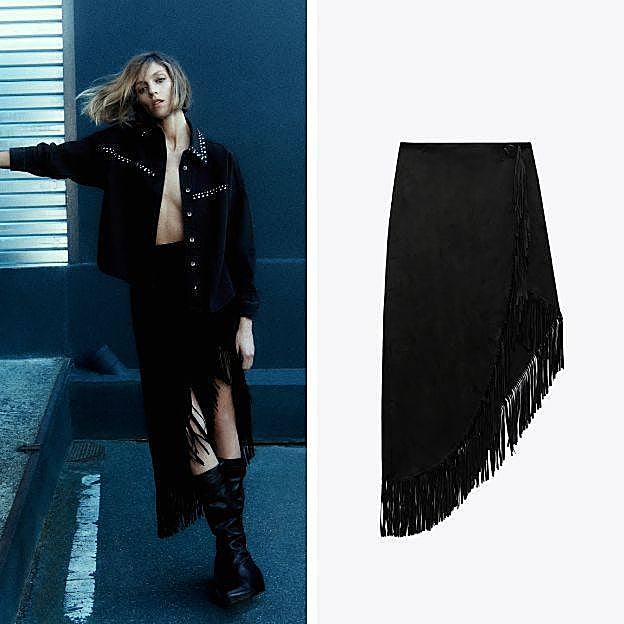 La última opción es una falda midi asimétrica efecto ante, con tiro alto, cierre frontal cruzado y bajo acabado en flecos, en negro, con un coste de 25,95 euros, una verdadera ganga para lo lujosa que luce. Queda fantástica con botas altas y chaqueta denim, con jersey oversize y tacones o con blusas glamurosas de fiesta, aunque con una camisa blanca, tendrás un outfit de 10 para la oficina.