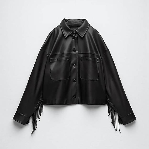 La clásica cazadora no podía faltar, la favorita de las 'it girl'. Zara propone un modelo de chaqueta efecto piel con cuello solapa, bolsillos delanteros de plastón, cierre de botones y una hilera de flecos que recorren la espalda y mangas, a un precio de 49,95 euros. Esta prenda no pasa de moda y viene genial para arreglar todos tus looks. Póntela con un vestido vaporoso o estampado floral, con un 'Little Black Dress', prendas de fiesta, conjuntos de punto o 'total look denim'. Incluso con un chándal neutro queda de escándalo.