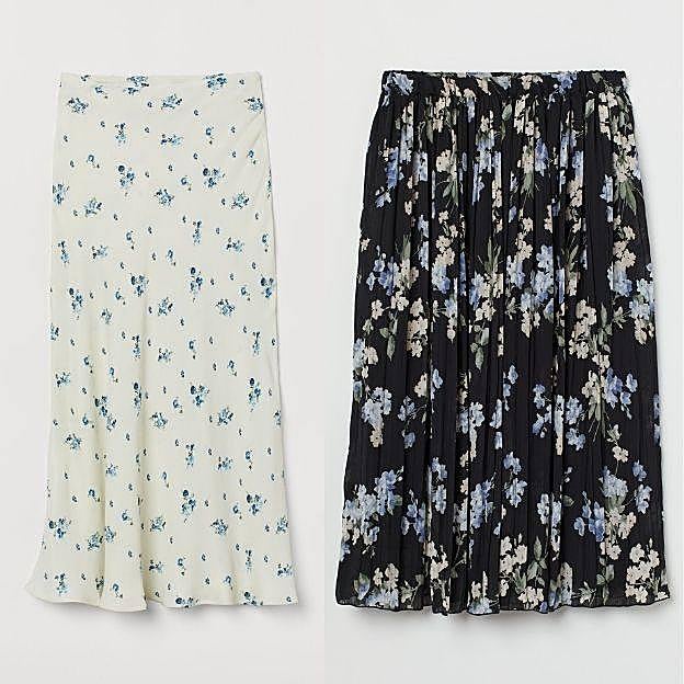 Continuamos con las propuestas florales de H&M en dos faldas. La primera, una falda midi con vuelo ligero y talle alte, que se ajusta a la silueta, en tono crudo con pequeñas flores en azul, rebajada al 40% por 23,99 euros. Y la segunda, una falda plisada por debajo de la rodilla, cintura elástica y corte evasé, en negro con estampado floral retro en azul y beige, de 24,99 euros a solo 9,99 euros.