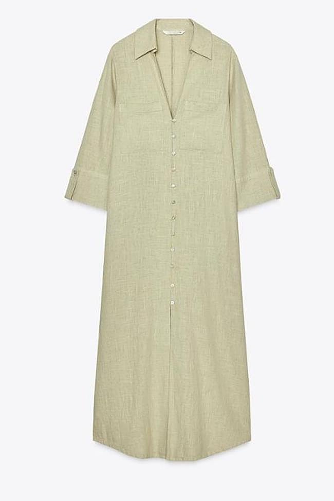 Seguimos con este vestido estilo túnica confeccionado con lino. Un modelo con cuello solapa con escote pico y manga por debajo del codo acabado con trabilla y botón, bolsillos delanteros de plastrón, bajo con aberturas laterales y cierre frontal con botones (39,95 €).