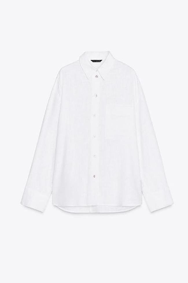 Empezamos por un clásico, una camisa amplia confeccionada con lino. Un diseño con cuello solapa y manga larga, bolsillo delantero de plastrón, bajo con aberturas laterales y cierre frontal con botones. Es un imprescindible en mi armario de verano (25,95 €).
