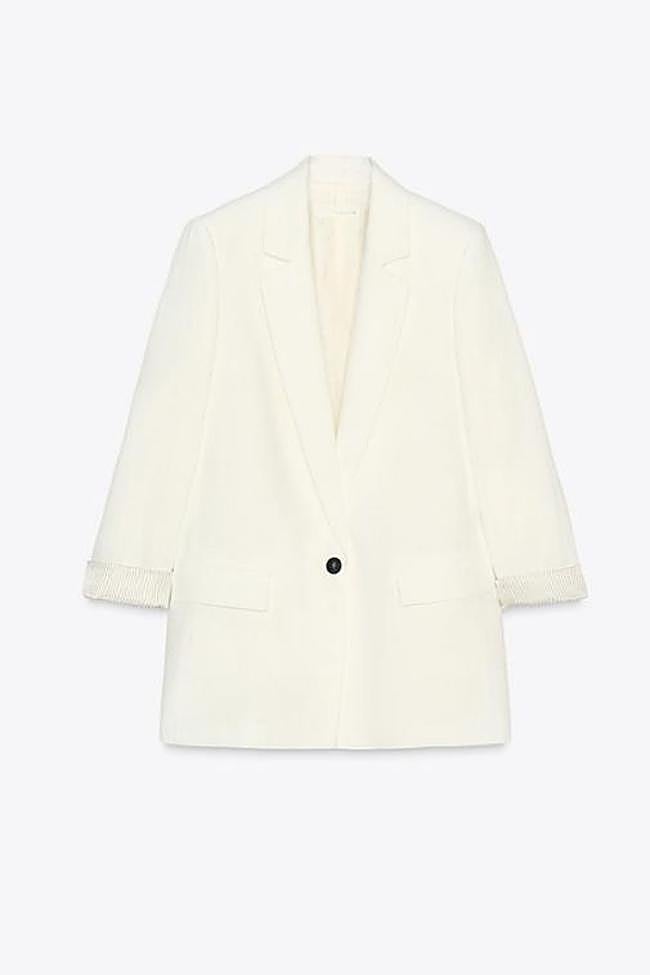La blazer blanca es mi chaqueta favorita para el verano, y esta confeccionada con lino me encanta. Es un modelo con cuello solapa y manga larga con hombreras acabada en puño con vuelta estampado, bolsillos con solapa delanteros y cierre frontal con botón (39,95 €).