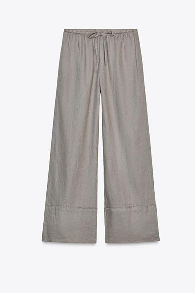 Comodísimo y muy estiloso, este pantalón palazzo confeccionado en hilatura de lino 100%. Es de tiro medio y tiene la cintura ajustable con cordones, bolsillos laterales ocultos en costura y pierna ancha (39,95 €).