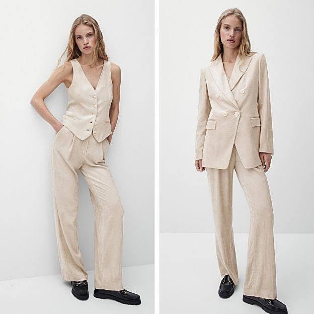 La primera es de Massimo Dutti, un conjunto de sastre compuesto por un chaleco de pana fluido con cierre de botones, escote pico y bolsillos delanteros de ojal, por 59,95 euros. Una americana cruzada con solapas puntiagudas, hombreras, bolsillos y doble botonadura, a un precio de 129 euros. Y, un pantalón de pana fluido estilo 'dad fit' con detalles de pinzas, tiro alto y pierna ancha, por 69,95 euros, en tono blanco (también disponible en rosa claro).