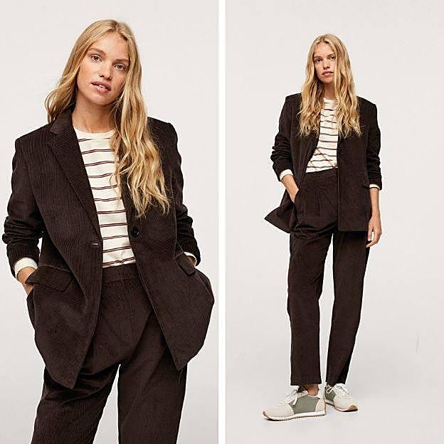 La segunda opción la encontramos en Mango. Se trata de un traje de americana con estructura recta, hombreras y cierre de botón, con un coste de 79,99 euros, exclusivo online, más un pantalón de pana de tiro alto con pinzas y trabillas para cinturón, a 39,99 euros, en marrón chocolate. Ideal tanto con botines de tacón como con mocasines o deportivas y una camisa de estampado paisley.