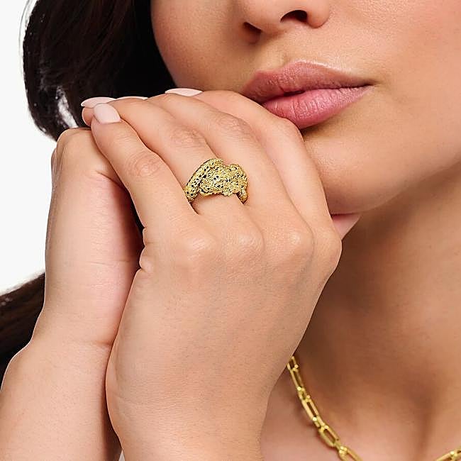 Este es un anillo de Thomas Sabo con forma de un cocodrilo reptando elaborado en plata de ley 925 con baño de oro amarillo 750. Es de efecto 3D con finas líneas de grabado y piedras de circonita negras y de color verde esmeralda engastadas a mano. Cuesta 549 euros.
