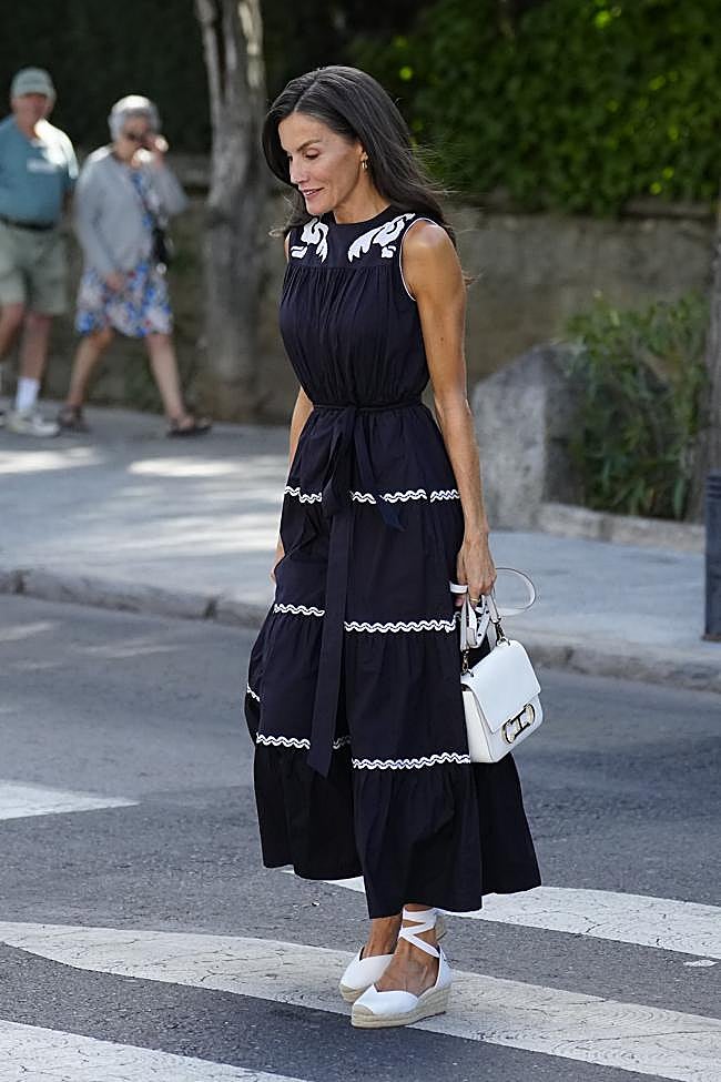 Por el momento, Letizia ha podido llevarlo aún en clave de verano con unas alpargatas cómodas y uno de sus bolsos favoritos, el bolso Initials Insignia de Carolina Herrera en color blanco y tamaño mediano con correa larga.