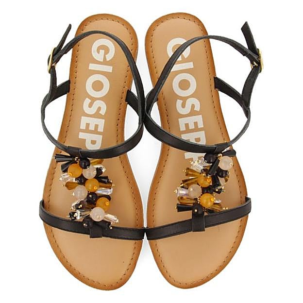 Se trata de unas sandalias de Gioseppo, una firma de calzado española de la que Elsa Pataky es embajadora y que se caracteriza por tener a la venta zapatos con diseños originales, pero que mantienen la comodidad y la calidad. Como es el caso de estas sandalias negras con tiras finas y adornos multicolor.