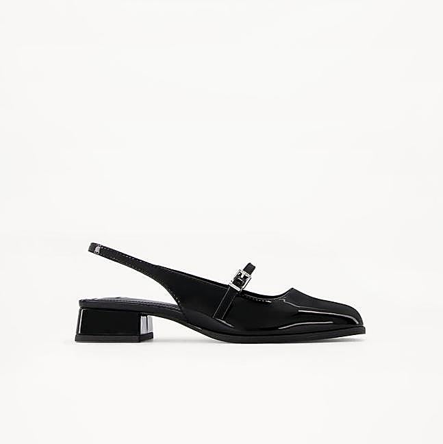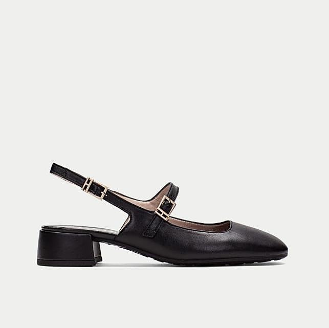 Hemos encontrado en el mercado varios diseños de zapatos destalonados que tienen también esa puntera redondeada, un tacón ancho y bajito y el detalle de la tira con hebilla que cruza el empeine. Y hemos elegido aquellos en color negro, ya que son los más ponibles. ¡Elige tu favorito!