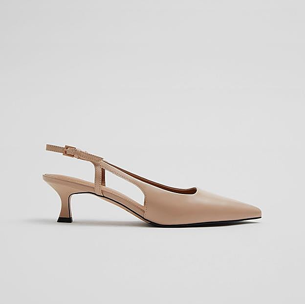 Zapatos de tacón puntiagudos y destalonados de & Other Stories con acabado brillante y tira ajustable en la parte posterior (119 euros).