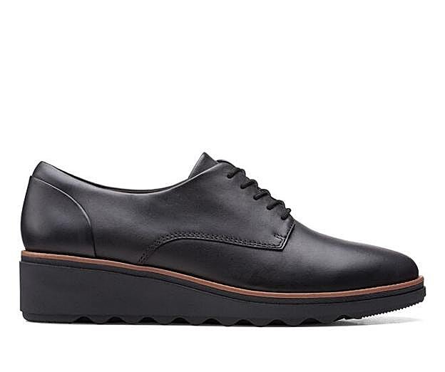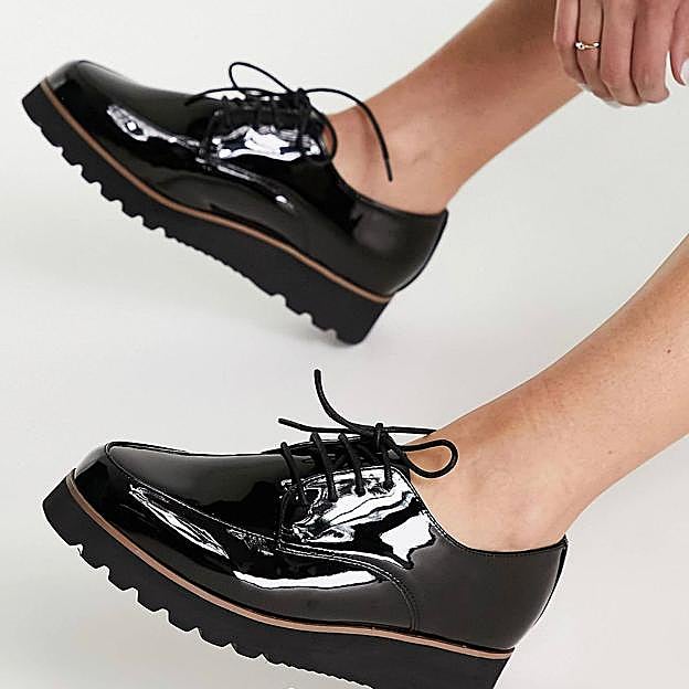 Y han sido estos últimos lo que más ha llamado nuestra atención de este look sobrio. Se trata de unos zapatos negros acharolados con cordones, es decir, de estilo oxford. Pero es un modelo cualquiera, sino un diseño con truco. Llevan una plataforma tipo cuña con la que aporta algo de altura a la figura, pero sin ir incómoda como puede ocurrir con los tacones.