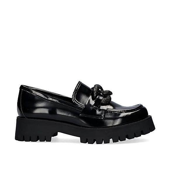 Mocasín de suela gruesa en color black con adorno en el empeine. Su corte y suela son de material sintético, la plantilla es de piel (99,95 euros).