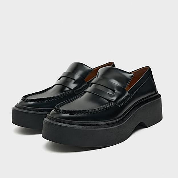 Zapato plano tipo mocasín en piel con suela tipo flatform y acabado en punta redonda (99,95 euros).