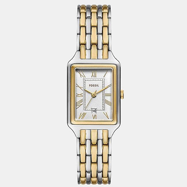 Este reloj es el modelo Raquel y tiene un diseño de 23 mm con una esfera satinada plateada, movimiento de tres agujas y fecha, y brazalete de acero inoxidable en dos tonos. Precio: 179 euros.