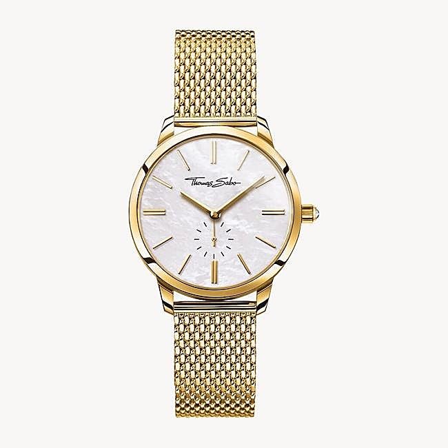 En un sutil mix cromático, el color oro amarillo y la esfera de nácar blanco de este elegante reloj para mujer con brazalete milanés armonizan a la perfección. Los índices y agujas en color oro amarillo, así como la corona adornada con una circonita blanca, lo llenan de centelleos confiriéndole un toque de extrema distinción. Precio: 269 euros.